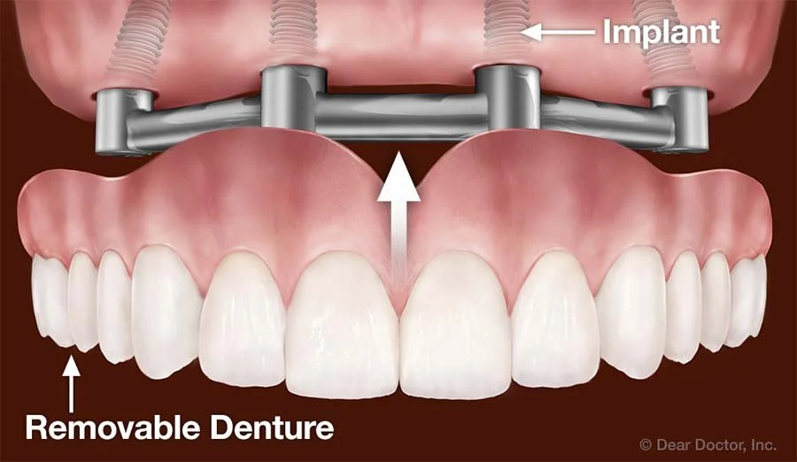 Support Removable Dentures — Implants can even make removable dentures more comfortable, effective and healthier to wear. Traditional dentures rest on the gums and put pressure on the underlying bone. This accelerates bone loss so that the jaw shrinks and the dentures slip, particularly on the bottom. But today dentists can attach a removable denture onto implants, transferring that pressure into the bone structure rather than the bone surface. This prevents the dentures from slipping while you eat and speak, and preserves the bone directly beneath them.